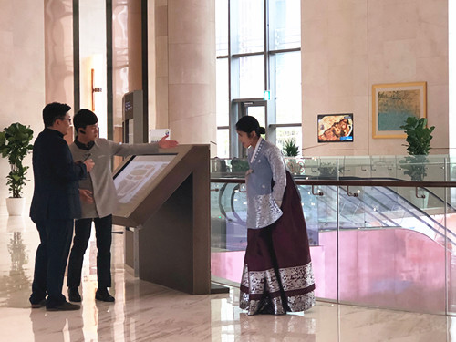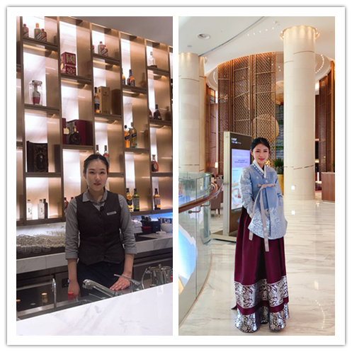 济州岛万豪酒店,是济州岛第一个万豪国际世界顶级水准的高端酒店,位于济州岛西南地区包含主题乐园、水上乐园、高端商业购物街、韩国顶级娱乐演艺中心等高端配置为一体,占地面积约250万平方米的济州神话世界。万豪酒店为实习学生提供签证、免费工装和优厚的实习待遇。经过报名、材料准备和面试,吕君芮、魏静茹两位同学脱颖而出,成功通过考核,成为万豪酒店的实习生。吕君芮同学实习岗位为前台接待,主要工作是负责欢迎游客、指引游客,让游客了解酒店的设施和各种服务场所以及当翻译,帮助游客与韩国职员交流从而更好地完成服务。魏静茹同学实习岗位为中餐厅,主要负责酒店VIP客户在餐厅用餐接待。