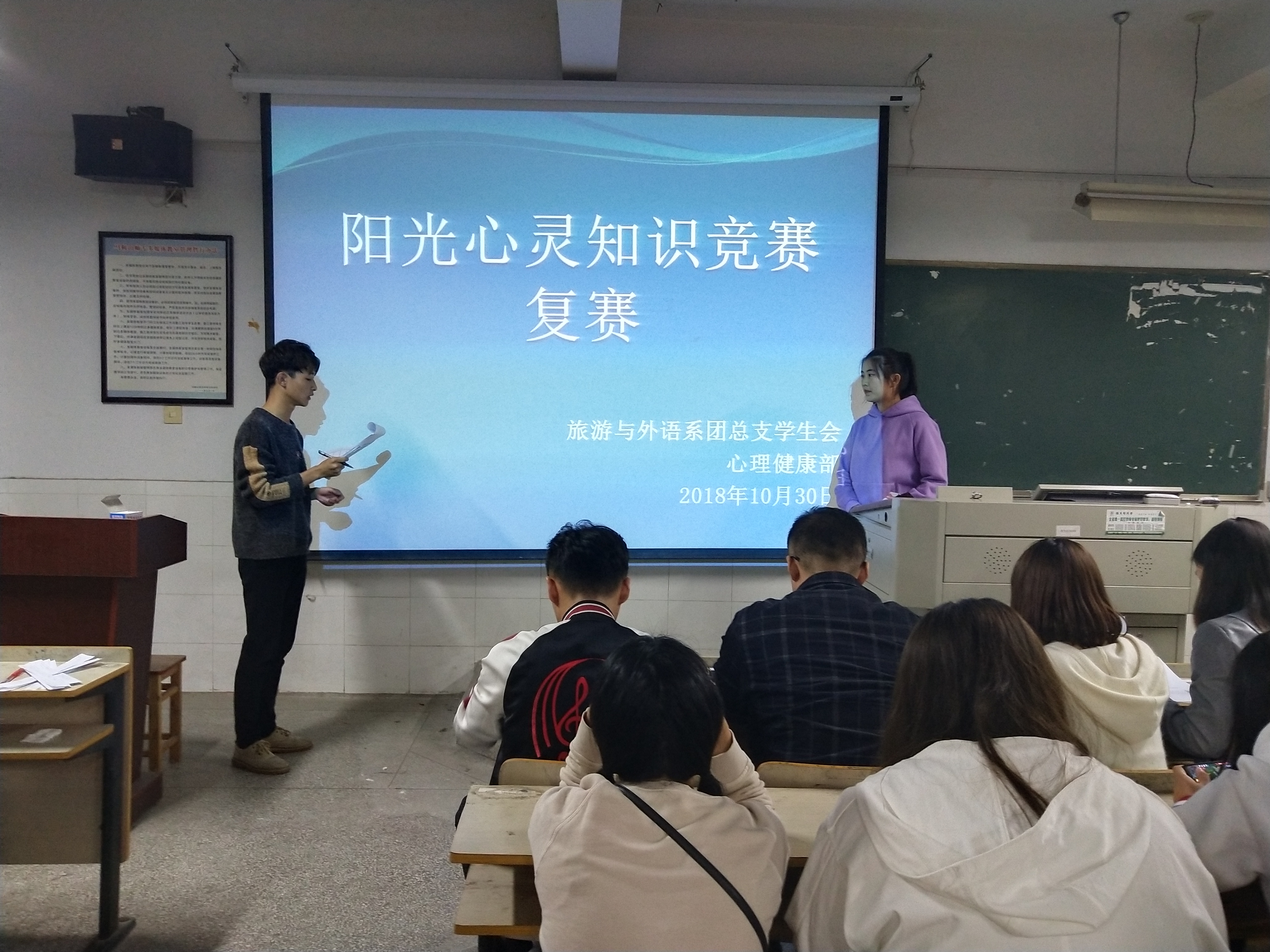 为了增强同学们的心理健康素质,普及心理健康知识,树立积极向上、乐观勇敢的人生态度,10月30日晚,旅外系学生会心理健康部在D407教室举办了阳光心灵知识竞赛。旅外系团总支副书记陈燕,辅导员童忠伟、陈盼盼、何静、毛亦艺出席本次活动并担任评委。