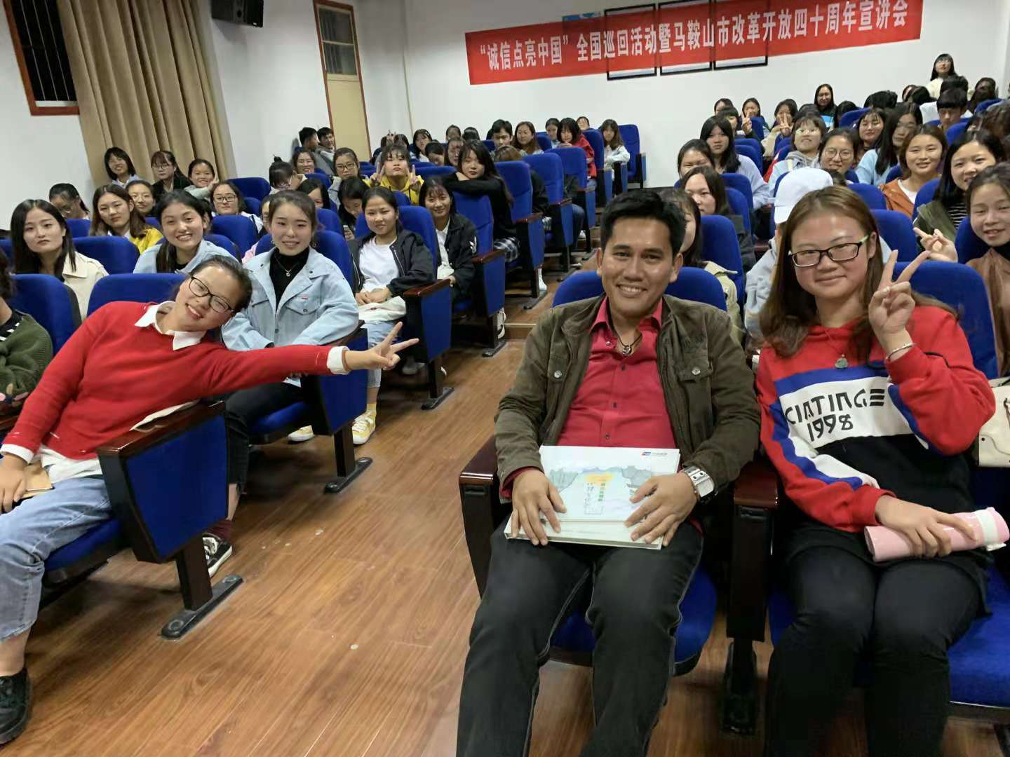 现场学习气氛轻松而热烈,活动中,外教老师介绍了自己的家乡和旅行经历,分享旅游服务中的技能和理念要求,尤其提出学习英语的要点——不要为考试而学英语,要为沟通和服务而学习,要把英语当成是水和空气一样亲密接触,尽情享用。张运老师代表旅游管理教研室全体师生向外教老师赠送了《旅游难忘安徽纪念册》、《马鞍山旅游指南(英汉双语)》和手绘马鞍山旅游地图作为纪念,并期望旅游管理专业的同学利用业余时间为外教做好英汉双语旅行服务工作,陪同外教老师游玩马鞍山,“以旅游的名义学英语”。