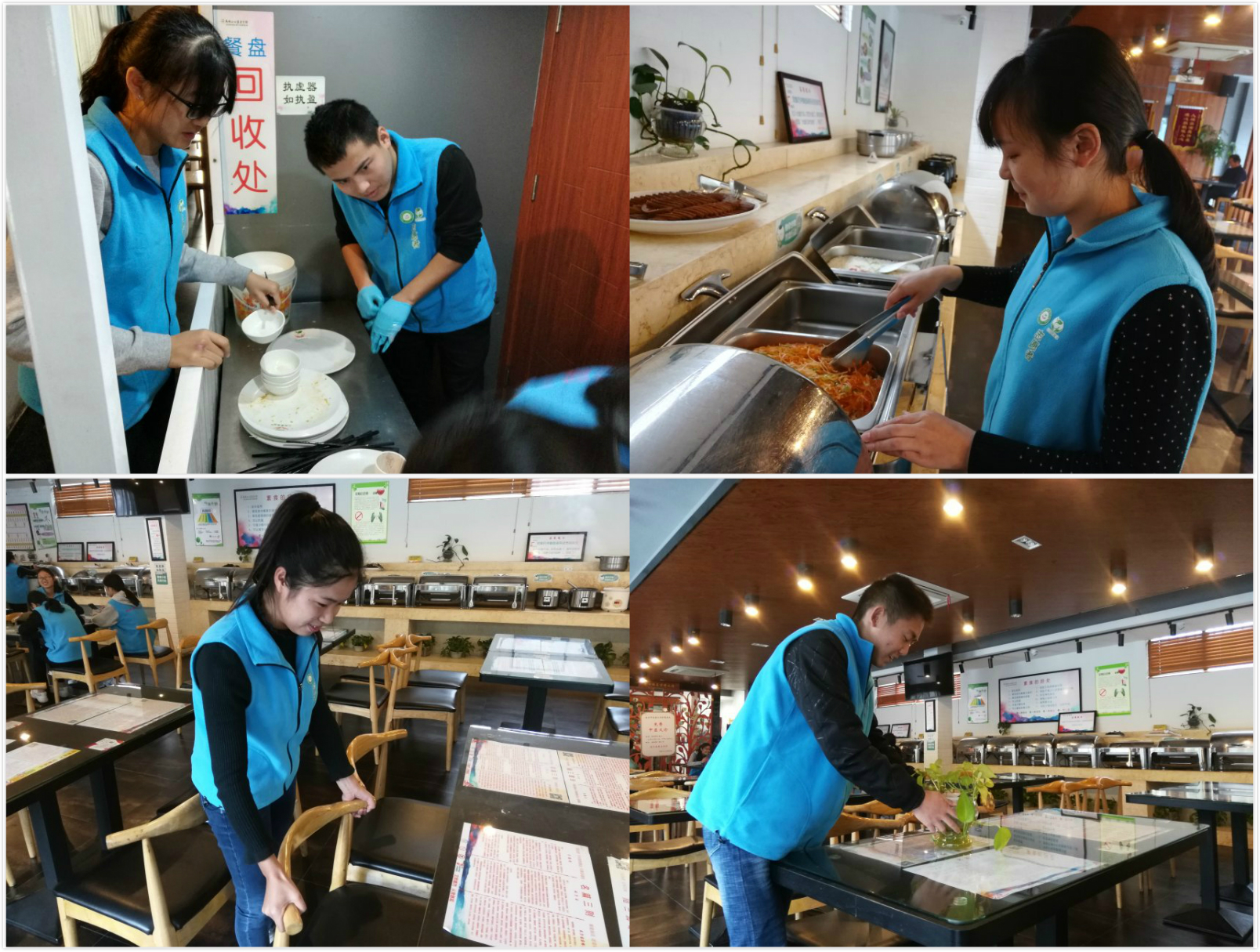 志愿者们准时抵达公益善食馆,随后在工作人员的带领下完成任务分配。有的负责礼仪迎宾,有的负责打扫卫生,有的负责择菜洗菜。在经过紧张的准备工作后,善食馆终于开始了营业。看到宾客们吃完离开座位时,志愿者们便拿起抹布擦桌子、整理桌椅,将饭桌上的饭粒和残渣等回收到垃圾桶里。在客人们就餐完毕将餐具送到回收处后,志愿者们热心帮助餐厅工作人员清洗、整理餐具,并向践行光盘行动的客人分发餐厅优惠券。志愿服务时间虽长达5.5个小时,但志愿者们却始终真诚待客、微笑服务。