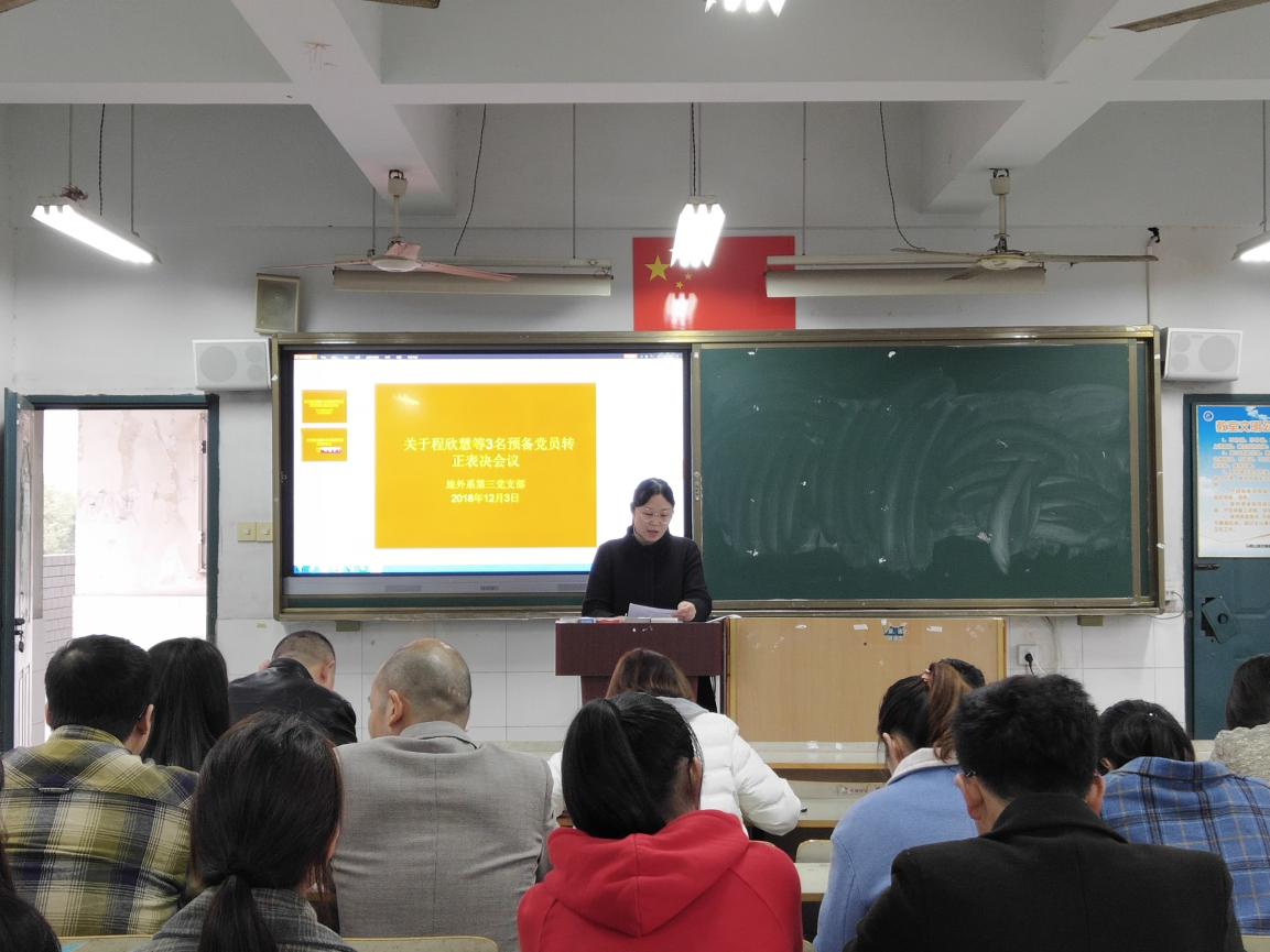 12月3日中午,旅外系第三党支部在博学楼301教室召开预备党员转正大会。会议由第三支部书记张军主持,第三支部全体党员以及本次转正的预备党员培养人参加了会议。