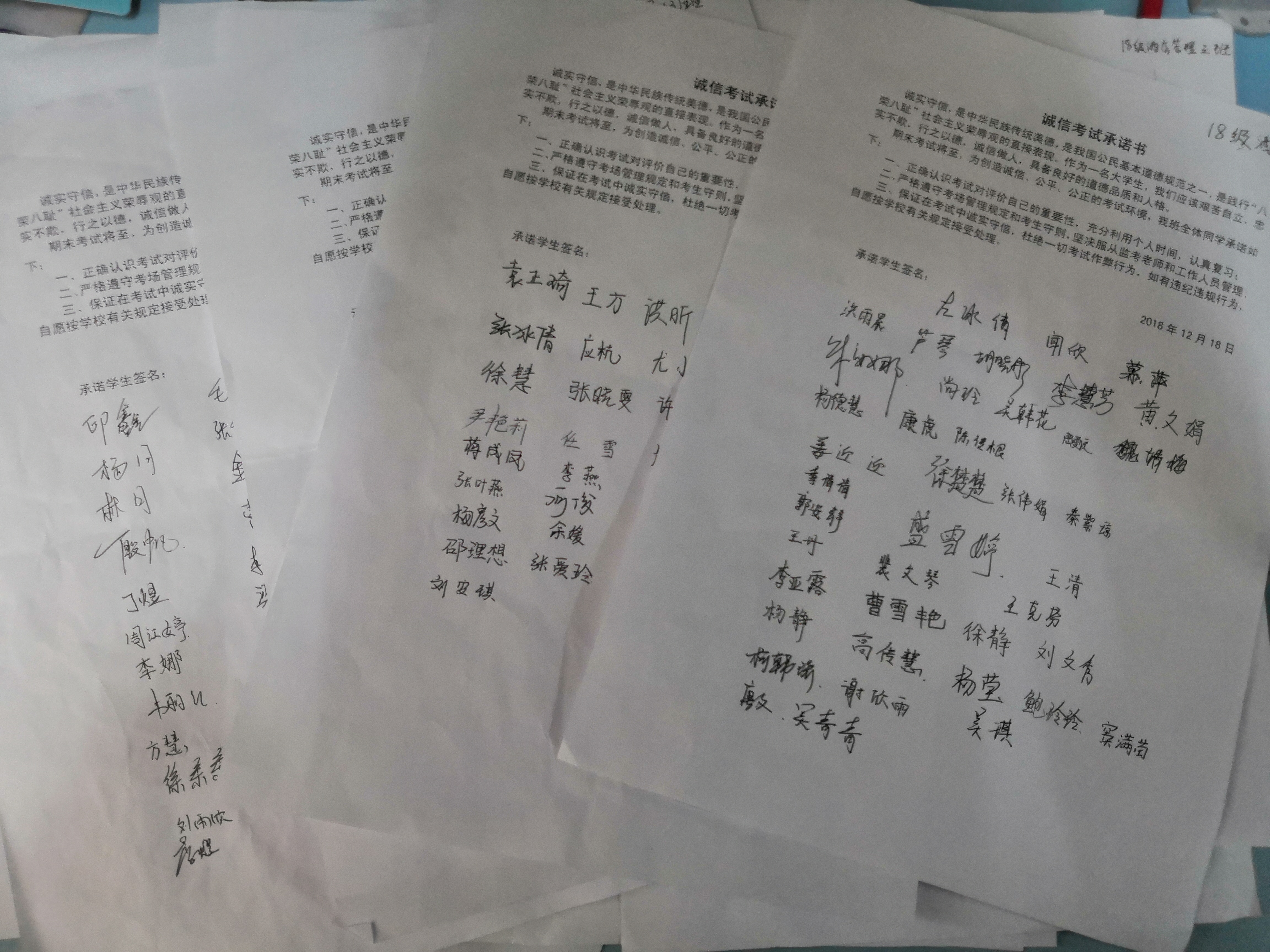 班会首先由各班班长或学习委员介绍此次班会的主题内容、目的和意义。有的班长或学习委员还阐述了自己对诚信的理解,并讲述了一些关于诚信的故事,希望同学们在考试过程中,注意小细节,不要让监考老师误会,给自己带来不必要的麻烦。接下来,各班级同学踊跃发言,和大家分享自己关于诚信的感悟与理解,内容涉及到了学习、工作、生活等方面。也有同学分享了自己的反面事例,用切身体会告诫大家不要做缺失诚信的事情,要做一个讲诚信的人。虽然不劳而获的事情很有诱惑力,但我们一定要坚守自己的信念,坚决抵制诱惑。最后,学生会学习部部长总结发言,鼓励大家要自尊自信,做个诚实守信的人,各班级同学分别在自己班级的诚信承诺书上签上了自己的名字。
