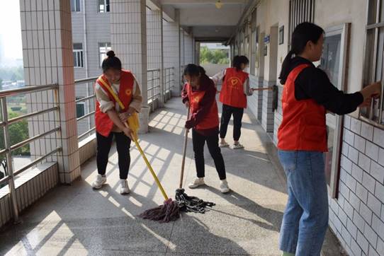 活动伊始,经队长和副队宣誓指挥后,志愿者两两成队负责各自楼层的卫生,各尽其责,合理有序使本次打扫活动有效进行中。当志愿者们身着印有“马鞍山师范高等专科学校旅游与外语系青年志愿者”的服装后,责任感由心而发。“撸起袖子加油干”的口号闪现在脑海中。打扫活动开始,青年志愿者们有的拿起抹布擦拭门和瓷砖,有的拿起扫帚清扫地面上的灰尘和杂物,有的则负责清扫后面拖地的重任。清晨的阳光洒在每一个志愿者的脸上,额头上的汗珠在阳光下晶莹剔透,劳动的喜悦感挂在每个人的脸上。打扫活动进行的如火如荼,时间在忙碌中悄悄的流逝,整栋楼打扫完成后已到中午时刻。