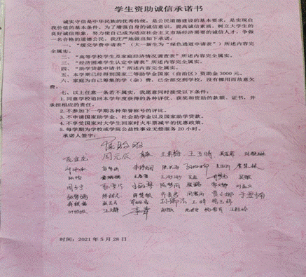 5月27日,由各班班长组织大一大二同学开展“诚信资助月”专题活动班会,会议上动员班级同学集体宣誓和签署诚信资助承诺书;特别提出当代大学生要培养诚信的良好道德品质,做一个重信用,守承诺的人。