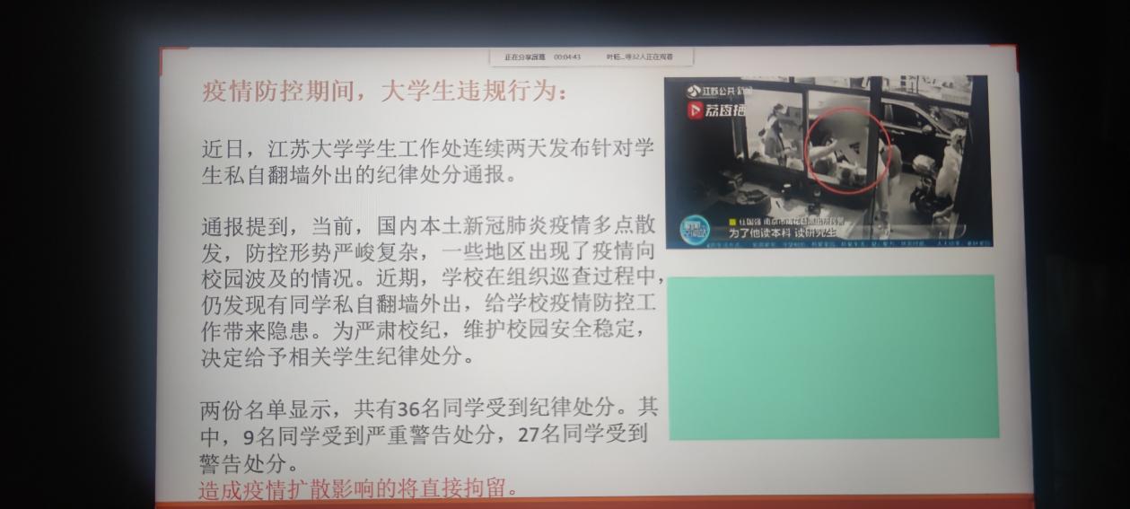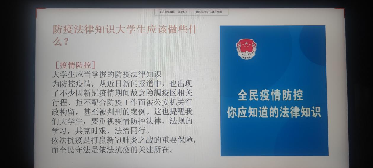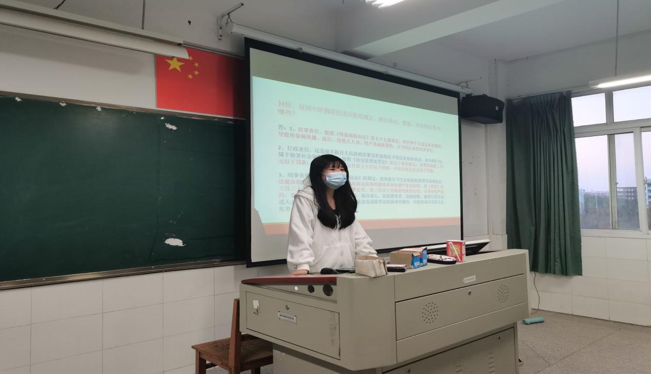 此次班会活动是在近期部分高校出现违反防疫法律法规现象的背景下召开的。各班级或采用线下或采用线上的方式进行,通过观看普法视频,学习有关疫情防控的法律知识。班干部结合最近发生的案例向同学们讲解了擅自外出、隐瞒行程等行为需要承担的相关法律后果,让同学们理解防疫的目的是为了保护人民的生命健康,引导同学们提高防疫意识,严格遵守学校防疫规定。