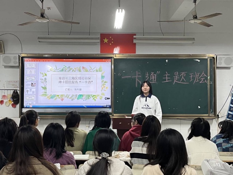 班会于晚上7点准时开始,各班班长首先向同学们介绍《安徽省推进长三角区域社会保障卡居民服务“一卡通”规定》是安徽省人大常委会于今年9月29日审议通过并已于10月1日实行的法律文件,接下来,各班班长带领同学们逐条解读《安徽省推进长三角区域社会保障卡居民服务“一卡通”规定》。通过学习,同学们认识到“一卡通”除了在交通出行、旅游观光、文化体验、社会保障、医疗卫生、金融服务等方面带来极大便利之外,还可以在上海、江苏、浙江等地通用。