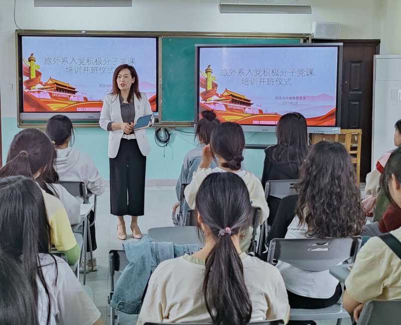 本网讯 5月22日中午,旅游与外语系2023年春季入党积极分子党课培训班在精业楼501开班,开班式以线上线下相结合的方式举行,雨山校区、滨江校区共65名入党积极分子参加。旅外系党总支书记徐基宏、组织员张军出席开班式。