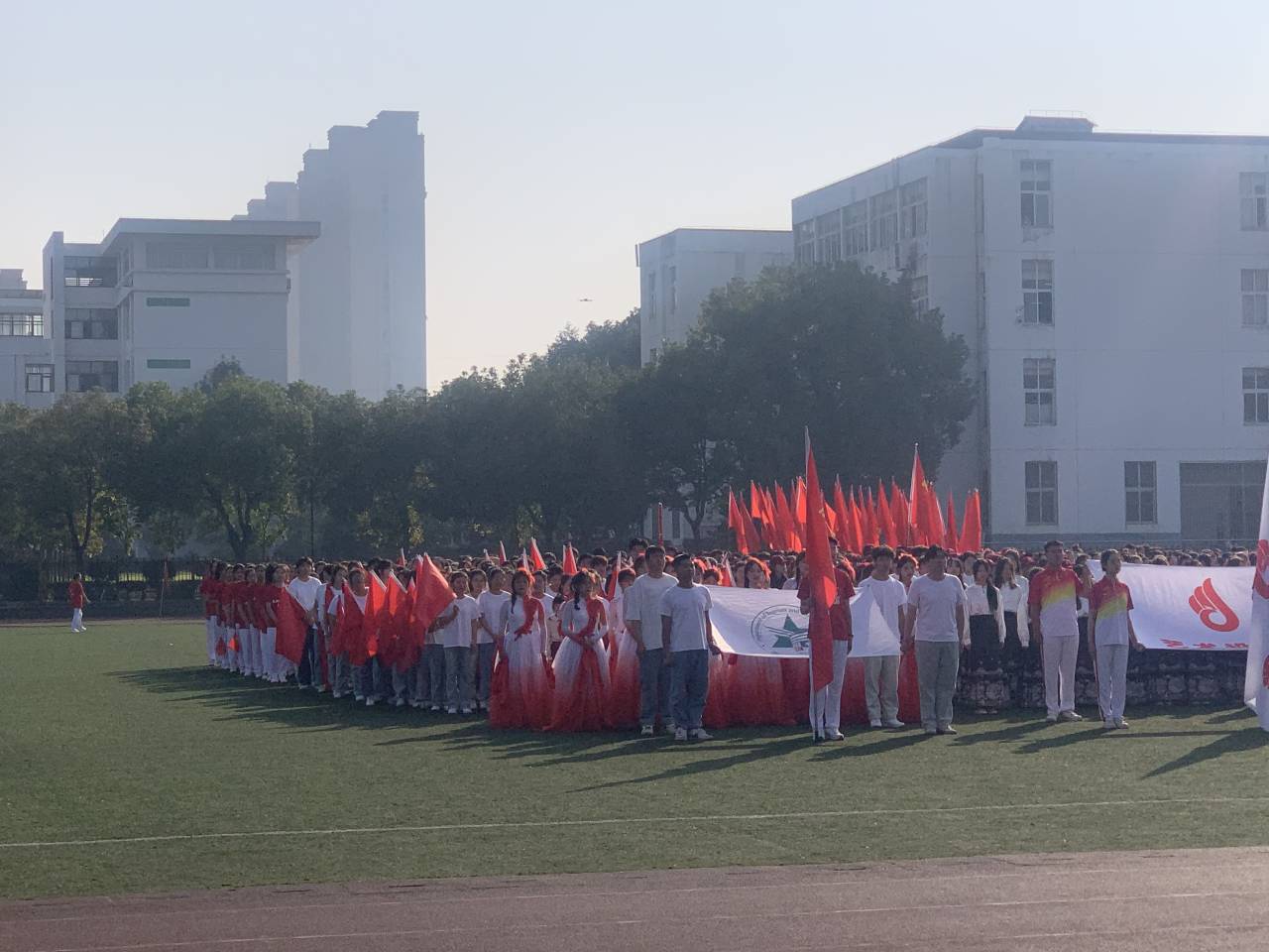 本网讯 2023年10月30日上午,第二十届校田径运动会在操场上举行开幕式和广播操比赛。旅游与外语系方阵的同学们喊着“逐梦赛场,展旅外风采;年少立志,壮锦绣山河”的口号从跑道走到主席台前。在广播操比赛前的开场舞中,排成五星闪耀的一百多名同学在《祖国有我》的歌声中不断变换队形,从方正的正方形到完美的同心圆再到五角星,令人眼花缭乱,开场舞在舒缓、优美的民族舞蹈中完美结束。开场舞结合了乐、阵型变换和民族舞蹈,令人过目难忘。场上同学们身着白色短袖浅色牛仔裤更是以青春洋溢的姿态点燃了在场每一个人的激情。接下来的广播操,伴随着音乐的节拍,同学们动作整齐划一,刚健有力,并在体转运动时巧妙的将“立志、修德、博学、精业”的校训融入其中。