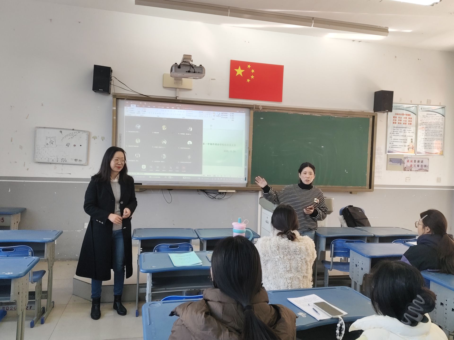 为及时掌握教学运行动态、优化教学管理服务,2025年11月26日中午,马鞍山师范高等专科学校外国语学院在滨江校区教学楼D202召开2025-2026学年第一学期教学信息反馈会议。会议以“教学运行问题梳理与优化建议”为主题,由学院督导员主持,采用“线上+线下”融合模式,2024级、2025级各班信息员现场参会,2023级各班信息员通过线上平台同步参会。